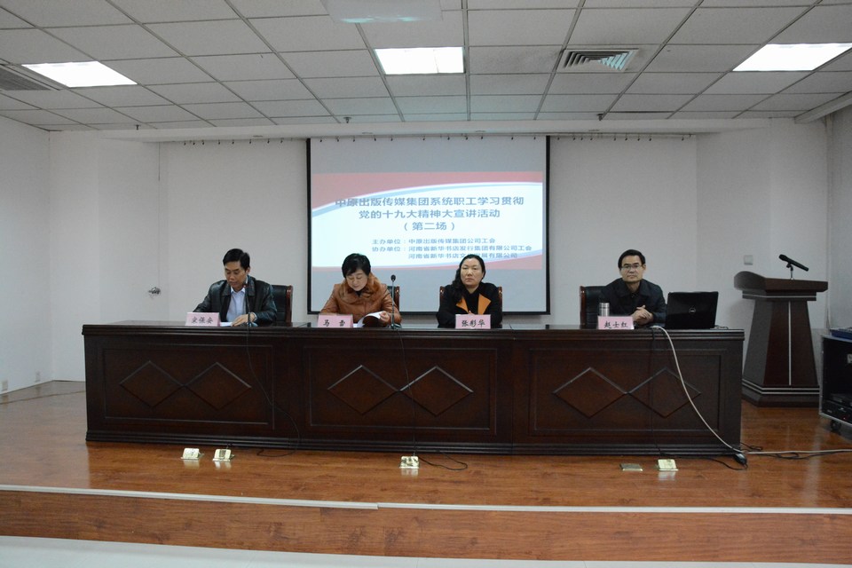 12月27日下午,按照《河南省總工會(huì)關于開(kāi)展河南省職工 學(xué)習貫徹黨的十九大精神 千名勞模大工匠·萬場大宣講活動的通知》要求,由中原出版傳媒集團主辦、河南省新華書店發(fā)行集團承辦的出版集團系統職工第二場學(xué)習貫徹黨的十九大精神宣講會(huì)在發(fā)行集團四樓會(huì)議室舉行,中原出版傳媒集團黨委委員、副總裁、集團直屬單位黨委書記馬雪總裁,集團工會(huì)副主席、集團直屬單位黨委副書記張彩華主席出席會(huì)議,發(fā)行集團班子成(chéng)員、中層人員、部分黨員和職工代表,及來自河南省新華書店文化發(fā)展公司、銷售與市場雜志社、《中學(xué)生學(xué)習報》社、出版對(duì)外貿易公司共6家單位150餘名幹部職工參加了此次宣講學(xué)習活動。 此次宣講活動由發(fā)行集團黨委書記宋保安主持,馬雪副總裁首先介紹了本次大宣講活動的目的、意義和要求。她指出,集團系統各單位可以結合自身實際,創新方式,深化學(xué)習,組織各級勞模工匠、基層一線湧現出來的先進(jìn)模範、技術能(néng)手等,通過(guò)職工大講堂、班組會(huì)等多種(zhǒng)接地氣的活動載體,開(kāi)展形式多樣(yàng)的基層宣講,做好(hǎo)黨的十九大精神的宣傳傳播,引導廣大職工更好(hǎo)地用十九大精神武裝頭腦、指導實踐,比學(xué)趕幫、團結奮進(jìn),讓十九大精神在集團系統廣大職工群衆中間落地生根、開(kāi)花結果,從而更好(hǎo)更快地推動集團産業升級和轉型發(fā)展。