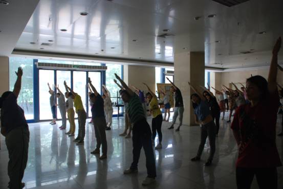 發(fā)行集團公司在開(kāi)展黨的群衆路線教育實踐活動中,積極響應廣大職工群衆訴求,豐富職工文化生活,認真貫徹落實全民健身計劃,從7月份起(qǐ),組織本部員工開(kāi)展了工間操活動,工間操選用的國(guó)家體育總局正式發(fā)布的第九套廣播體操。此項活動得到了廣大職工的積極響應和熱情參與,大家就(jiù)近在走廊或辦公室等地,在輕快優美的旋律下,認真按标準做好(hǎo)每一個動作,舒展四肢、鍛煉身體,消除亞健康狀态。通過(guò)開(kāi)展工間操活動,增進(jìn)了廣大職工身心健康,削除了疲勞,提高了工作效率,也培養了員工的團隊精神,營造了和諧健康的企業文化氛圍。